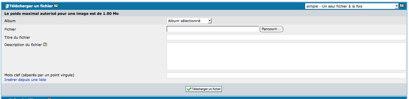 No file was uploaded ! If you have really selected a file to upload, check that the server allows file uploads... Les téléchargements de fichiers sont désactivés dans le php.ini ou il y a un problème de droits avec le mecanisme de téléchargement de votre serveur. Il peut y avoir plusieurs raisons pour ce message d'erreur. Le fichier que vous essayez de télécharger n'a pas "atteint" le dossier du serveur ou il était sensé aller. Vérifiez si il y a un problème avec le téléchargement HTTP sur votre serveur - cett efonction a peut être été déactivée ou mal configurée. Dans le phpinfo(), vérifez que "file_uploads" est sur ON, "upload_max_filesize" a une valeur du genre 2M et "upload_tmp_dir" est un répertoire valide! Assurez vous de bien vérifier une fois de plus les droits pour vos fichiers/répertoires.