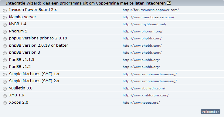 In the first actual step of the wizard "choose application to bridge coppermine with", you have to choose the application you actually want to coppermine with. Note that you must have this application already installed on your webserver, it has to be properly configured and must be up-and-running. Don't use the bridge manager yet if you only plan to integrate coppermine with another application later.
